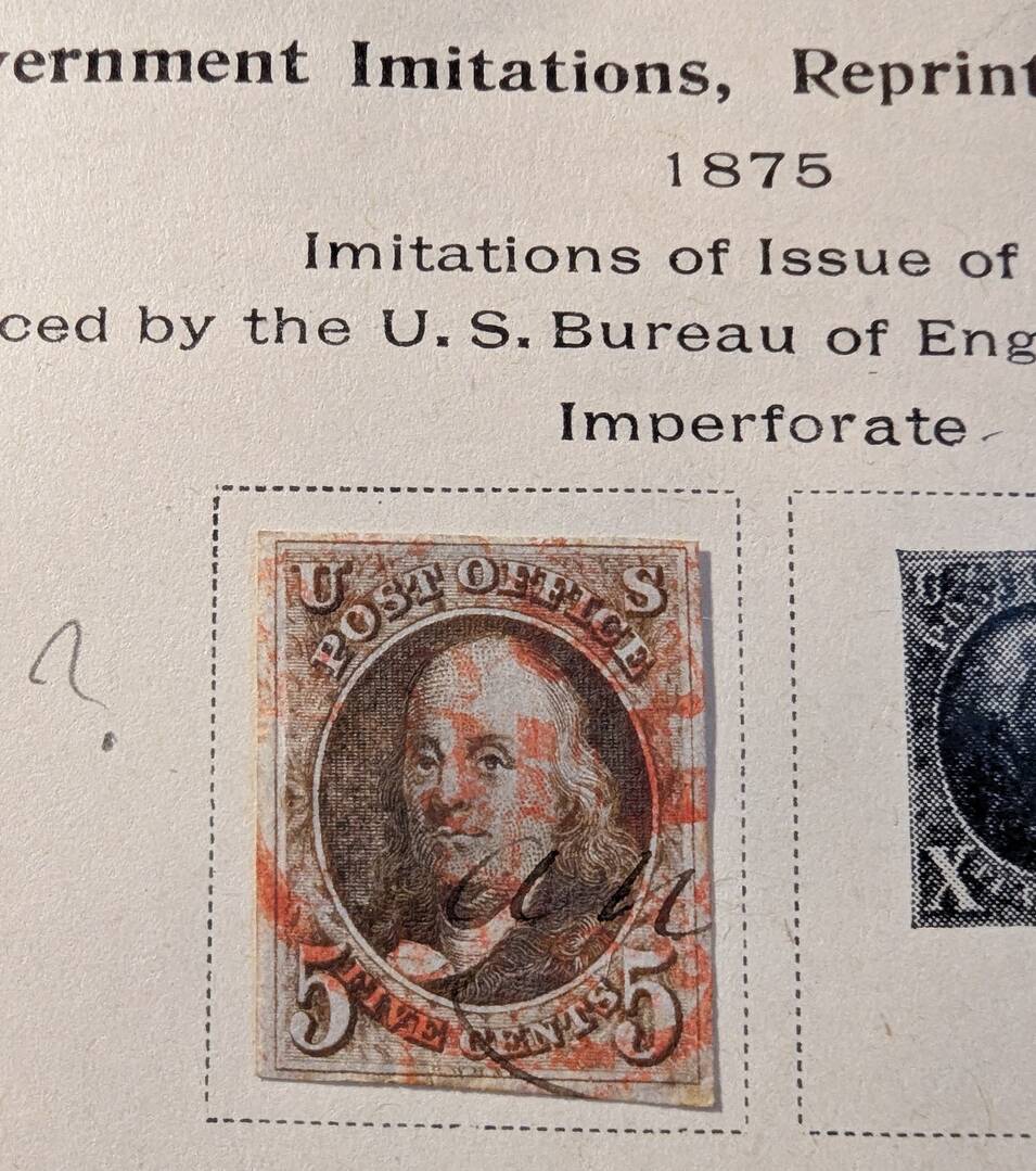 This is not a reprint. This is a Scott #1. It appears authentic with a red circular date stamp and pen cancelations. Looks to be four margins just riding along the top. If there are not thins or creases I’d value this around $200. If there are faults it could go down from there, and quite significantly depending on the severity of the faults.